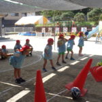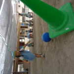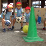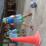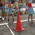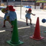 カラーコーンを狙ってボールを転がしたり投げたりと