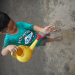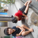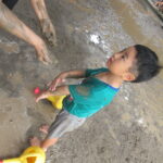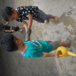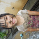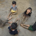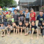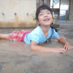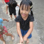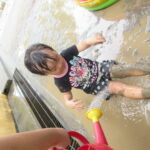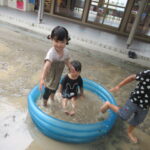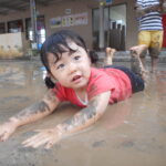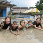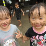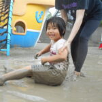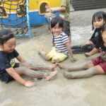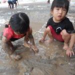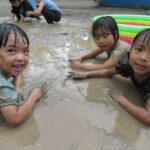 園庭に水を撒いてできたどろんこのなかで、思いっきり遊ぶ子ども達は
