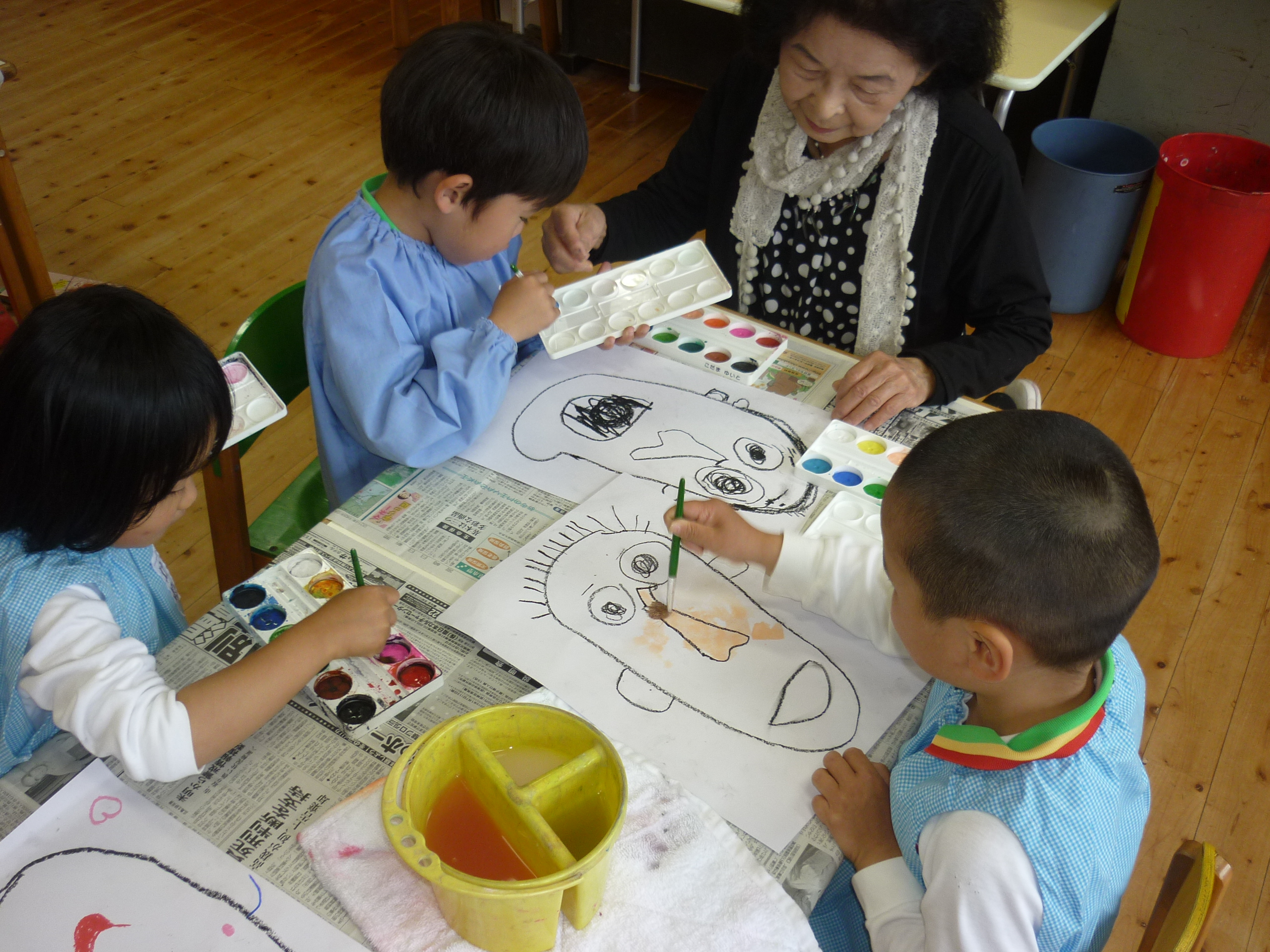 思い切りよく大胆に、画用紙いっぱいにまだ慣れない絵の具を使って