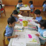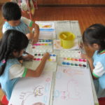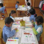 絵画教室でした [2017年10月18日] 今日は年長さんの絵画教室がありました。 今回のテーマは「どうぶつ」でした。 うさぎやキリン、ライオンなど自分の好きな動物を 画用紙いっぱいに描き進める子ども達。 躍動感あふれるカラフルでたのしい絵が出来上がりました。 うめ組の後ろの壁に展示していますので、どうぞご覧ください! 今週はすっきりしない寒い日が続いています。 風邪などひかないように、体調には十分気をつけて過ごしたいですね。 ◎一覧を表示する ◎管理者