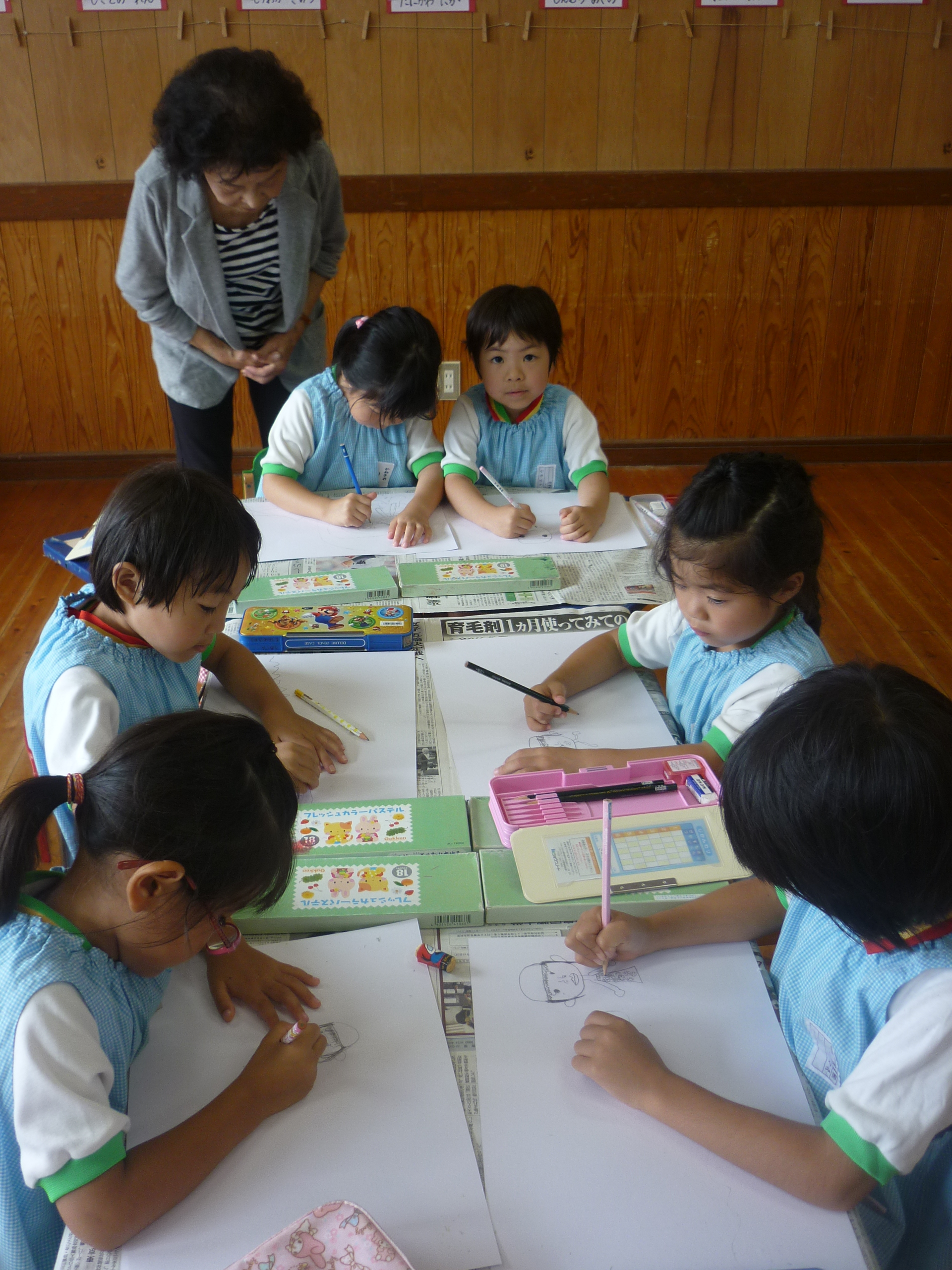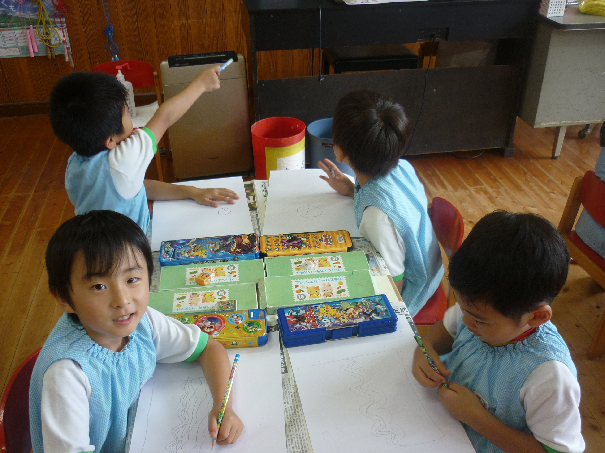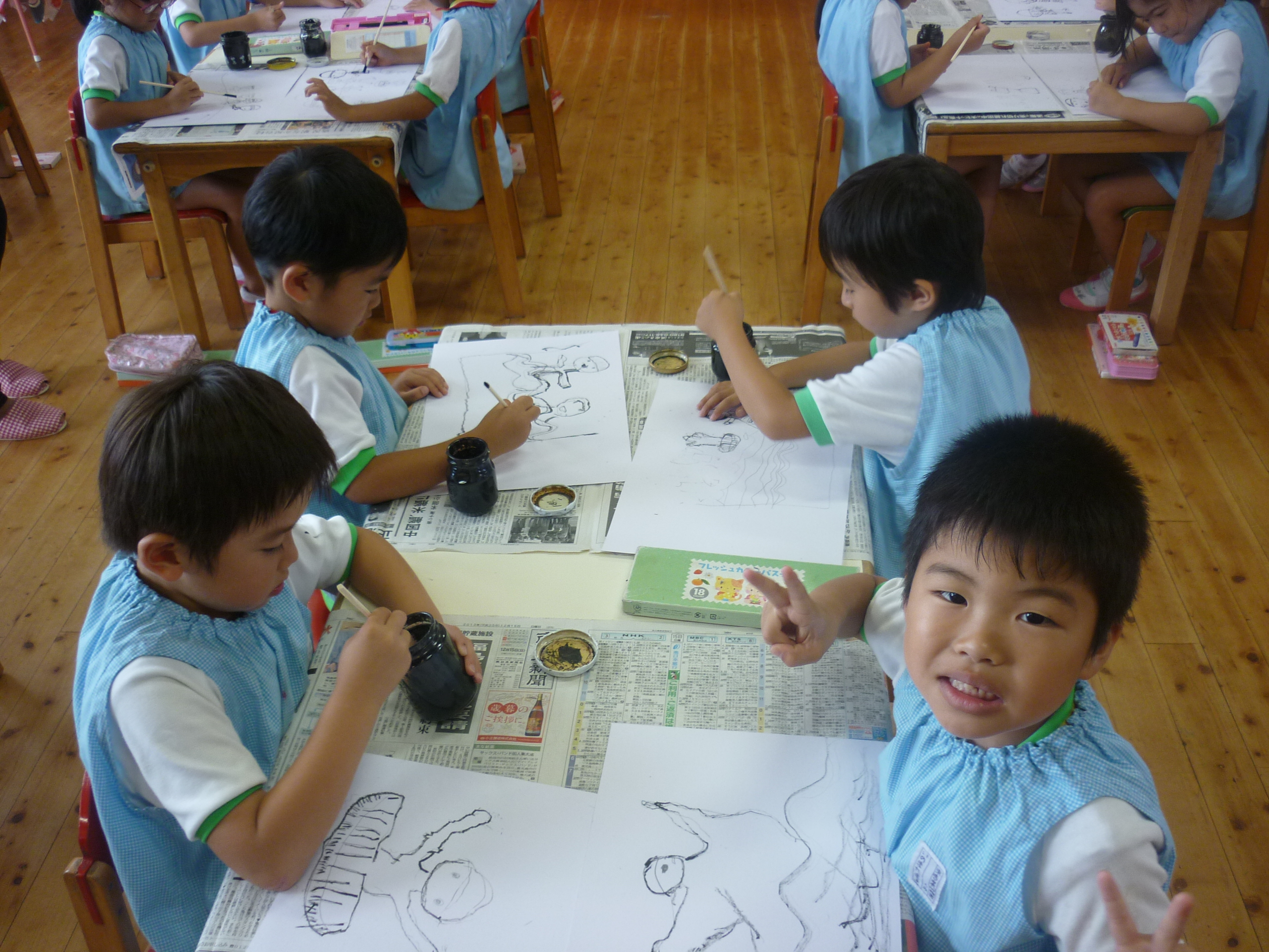 絵画教室でした [2014年07月11日] 8日(火)は月に一度の絵画教室でした。 今回のテーマは「みずあそび」ということで、 児玉先生のお話をとても真剣に聞きながら プールあそびの様子をのびのびと描く子ども達。 すごい集中力でした。 今回もとてもにぎやかでユニークな 個性あふれるすばらしい絵が仕上がりました。 うめ組の部屋の後ろに掲示してありますので ぜひご覧くださいね! ◎一覧を表示する ◎管理者