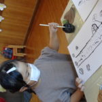 割りばしに墨をつけて描く初めてのやり方に苦戦しながらも
