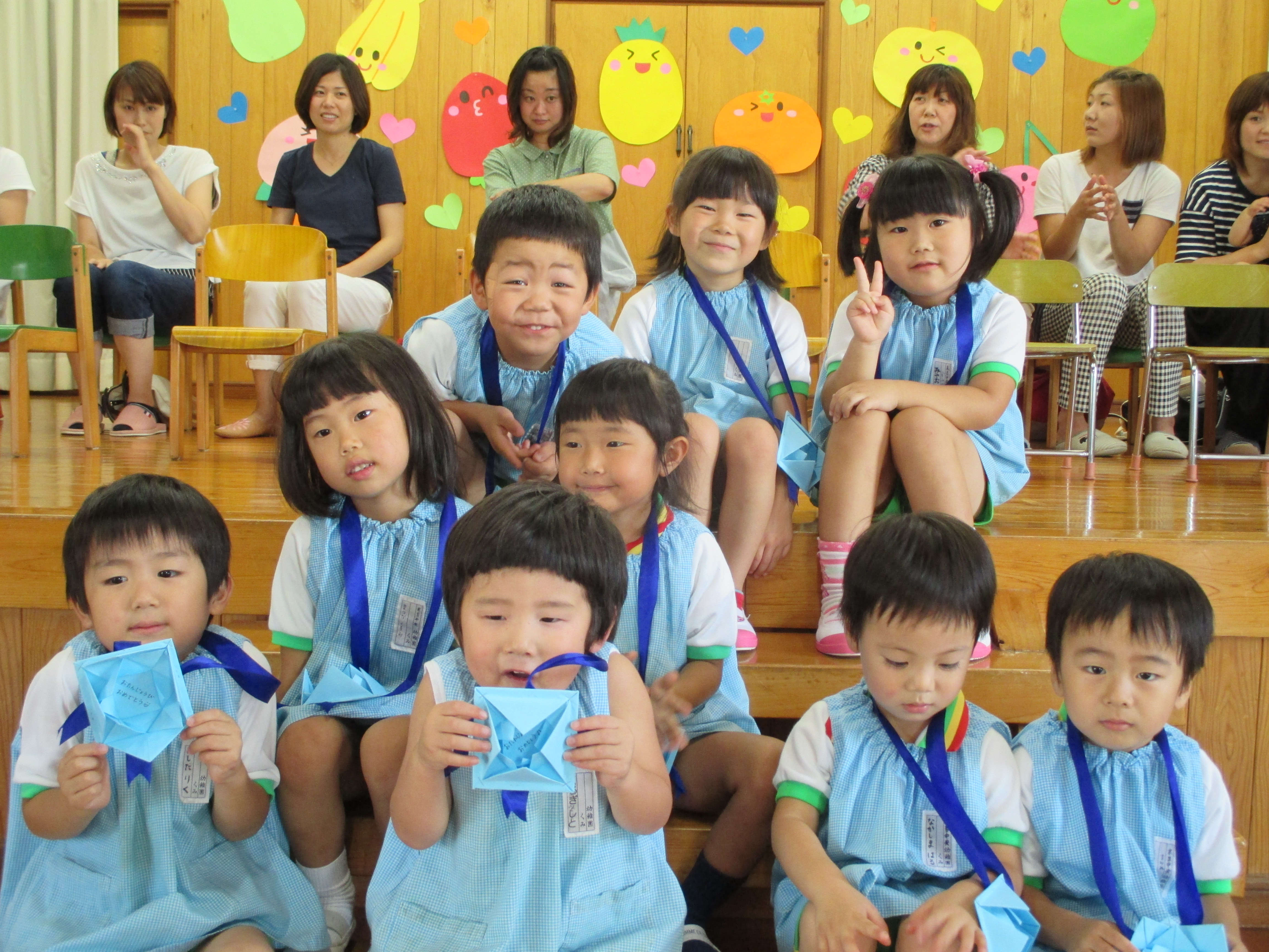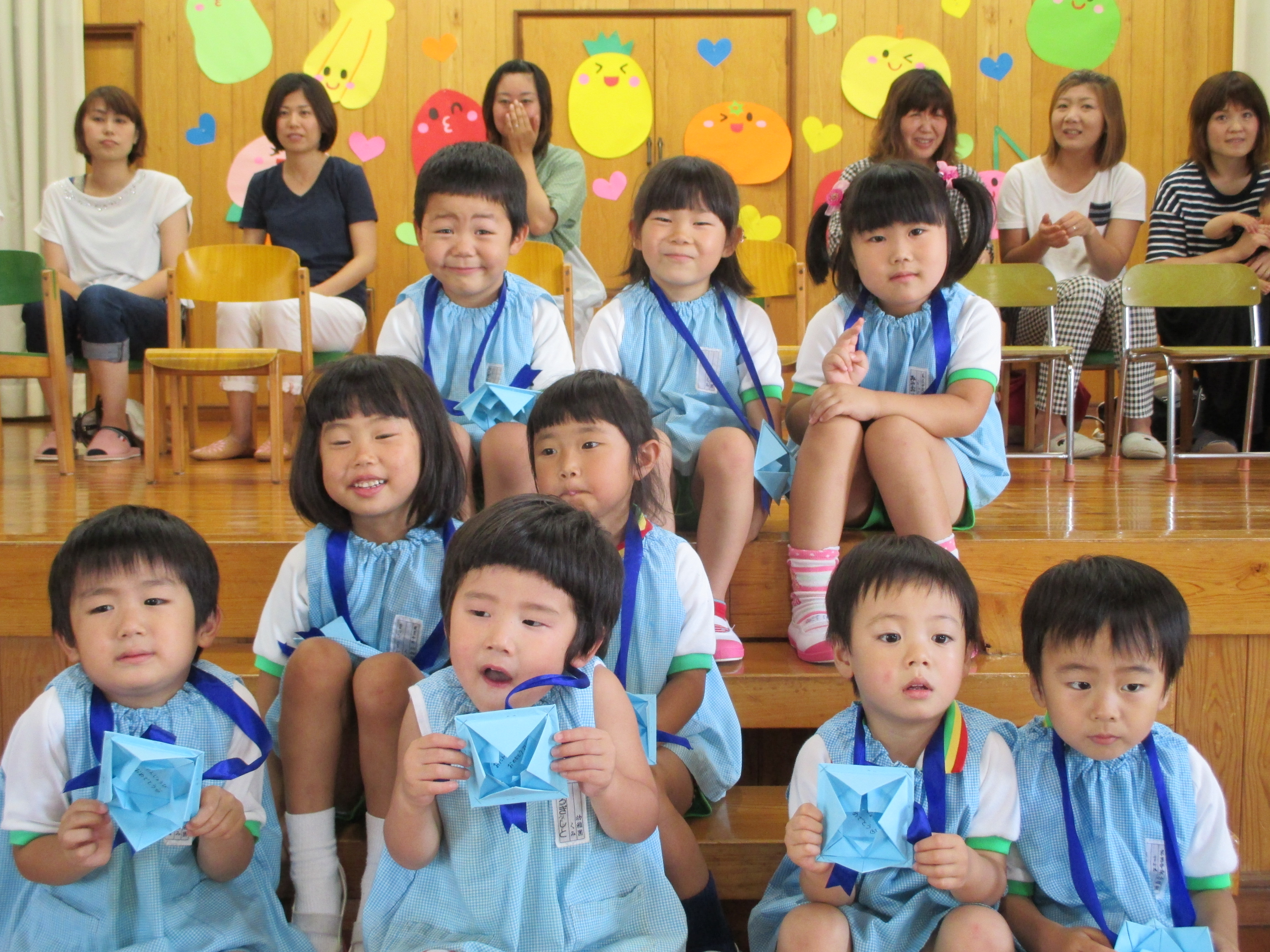 舞台に上がった6月7月生まれの誕生児のお友だち9名を